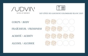 Cépage typique de cette région du Sud-Ouest, ce Colombard possède un profil très aromatique et une structure équilibrée. On y retrouve des arômes de fruits exotiques et d’agrumes bien présents ainsi que des notes florales.