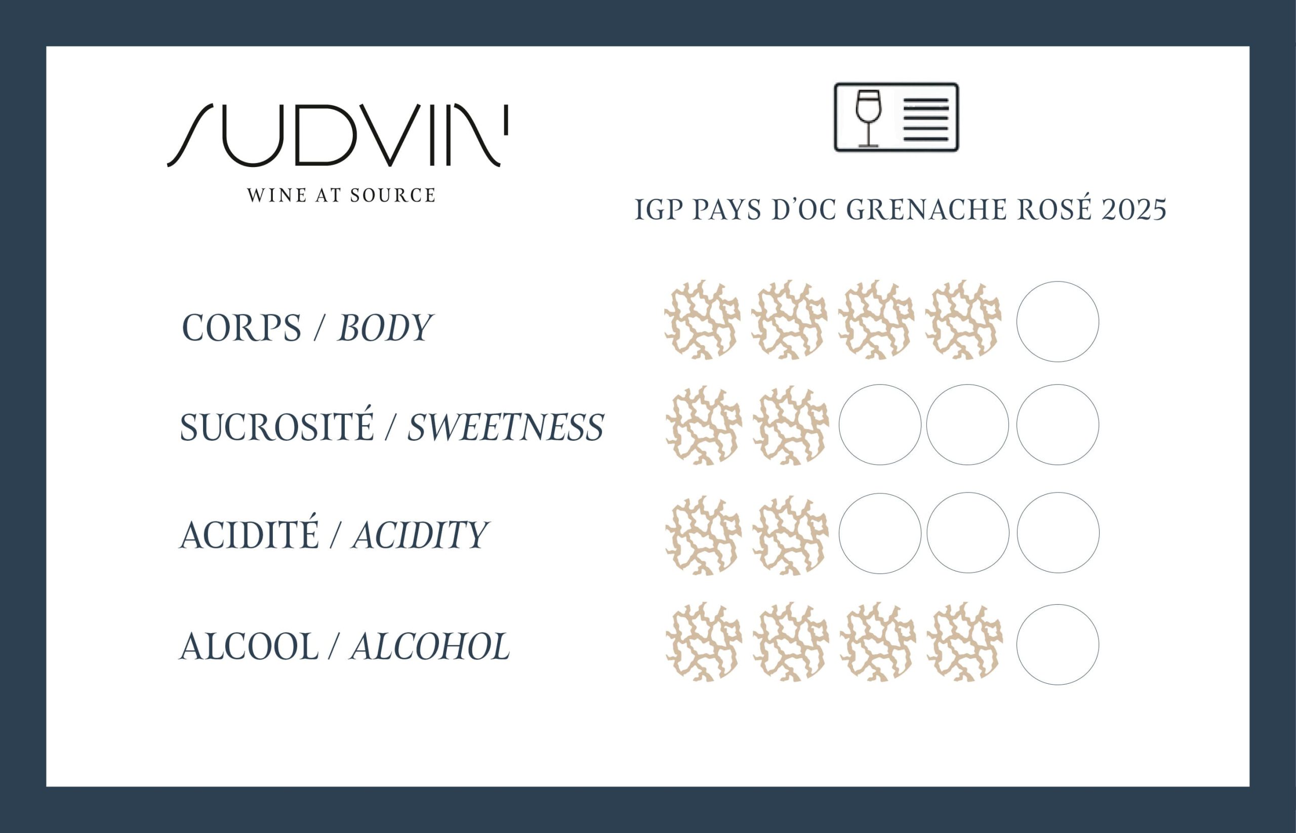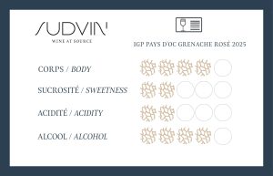 Cépage incontournable de cette IGP, ce Grenache rosé possède un profil aromatique et une structure équilibrée. On y retrouve des arômes de fruits rouges et fruits blancs.