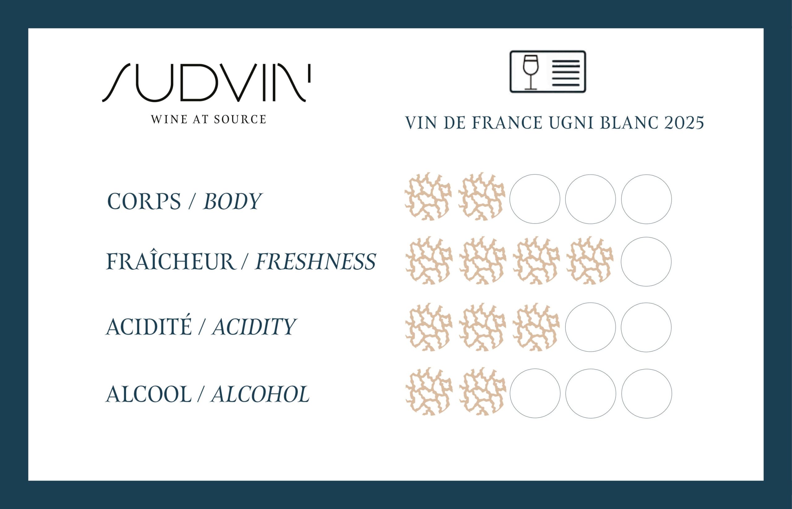 Idéal pour des bases mousses, ce vin blanc vif et léger propose des notes d’agrumes et amylique, typiques du cépage Ugni.